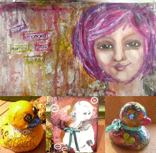 Shelly and I have something in common – we both submitted art to the Cloth Paper Scissors calendar contest this year.  Below is her delightful entry, painted on license plates!  I LOVE it!  Please do check out her blog!